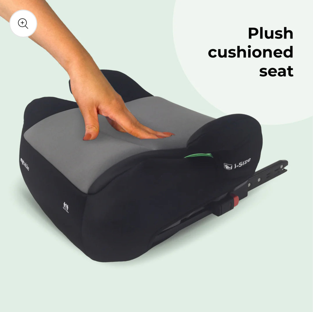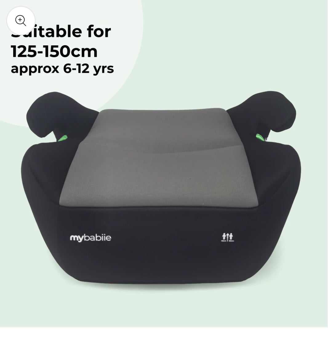 The My Babiie i-Size backless booster seat is suitable for children from 125-150 cm (approx. 6 to 12 years). You are safe in the knowledge that this booster seat is approved to R129 safety standards with the extra firm ISOFIX plus belt install. With a luxurious black and grey padded seat and padded armrests, this booster seat is designed to ensure your child travels in comfort and safety.